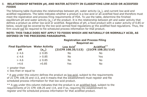 위의 표에서 4.6 이하의 제품은 ACIDIFIED에 해당이 되며 이는 저산성화 된 제품이 아니기때문에 미생물이 살수 있는 조건이 좋다. 그렇므로 미국FDA에서는 까다로운 공적등록 자료를 FDA에서 요청한다. - 저산성 식품